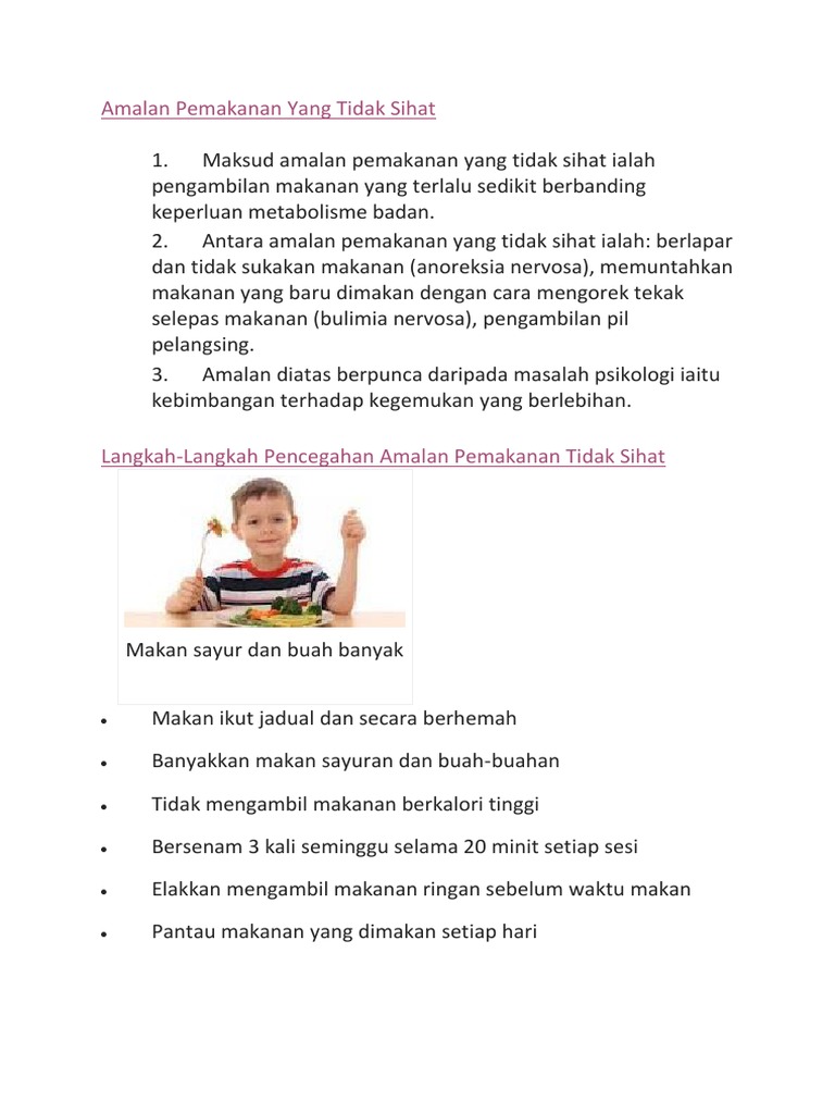 Makanan yang sihat mengandungi jumlah zat dan kalori yang seimbang untuk kesihatan tubuh, mencegah kekurangan dan kelebihan pemakanan. Antara sebab kenapa ramai pengguna. Usaha kecil yang bermula hari ini mungkin akan. Pentingnya menyediakan menu makanan yang. Bercakap mengenai amalan pemakanan seimbang, adakah anda tahu apakah jenis makanan sihat yang baik untuk kesihatan badan? 2001 amalan dan pola pemakanan dalam kalangan pelajar universiti ini dilihat dari enam aspek iaitu pilihan menu makanan, waktu makan, tempat makan, perbelanjaan untuk makanan dan persepsi responden tentang tujuan makan dan perkara yang berkait dengan makan. Rasulullah saw merupakan seorang yang mementingkan kesihatan. Sediakan snek yang sihat dan bukannya memilih keropok dengan minuman. Perdu cinta 2 mac 2020 7:32 ptg. Langkah mengatasi masalah pencemaran bahasa.docx. Pengajaran yang kita perolehi daripada video ini ialah 'amalkan pemakanan yang sihat' untuk kesejahteraan sepanjang hayat. Remaja yang tidak sihat akan menjadi orang dewasa yang tidak sihat. Antaranya ialah, memberi faedah kepada pencapaian dan pembelajaran pelajar seperti penumpuan di dalam kelas dan peningkatan daya kefahaman dan ingatan mereka.