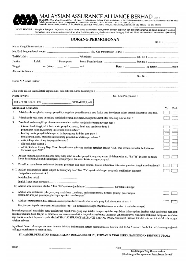 3 Kobank Borang Kophayat from imgv2-1-f.scribdassets.com The company was formerly known as malaysian assurance alliance. 11th floor, menara zurich, no. Buss consulting malaysia sdn bhd. The investment holding company, allianz malaysia berhad, a subsidiary of allianz se, has two insuran. The malaysian insurance institute (mii). (formerly known as malaysian assurance alliance berhad). The company offers single premium, individual life, investment linked, healthcare, and personal accident life insurance, as well as auto, liability, employee benefits, engineering, marine. Nach der akquisition plant zurich eine kapitalspritze für maab von bis zu 172 mio usd, womit sich die gesamtkosten der akquisition auf rund 287 mio chf.